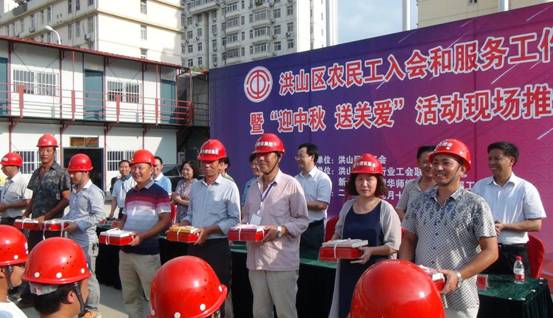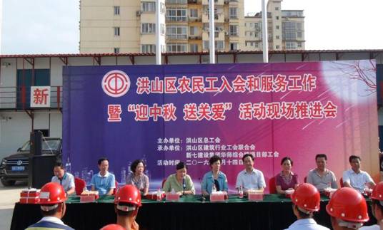 2016年9月14日下午,临近中秋佳节前夕,武汉市总工会、洪山区总工会、洪山区建筑业工会联合会在我校南湖综合楼工地现场主办了一场洪山区农民工入工会和服务工作暨“迎中秋,送关爱”活动现场推进会。