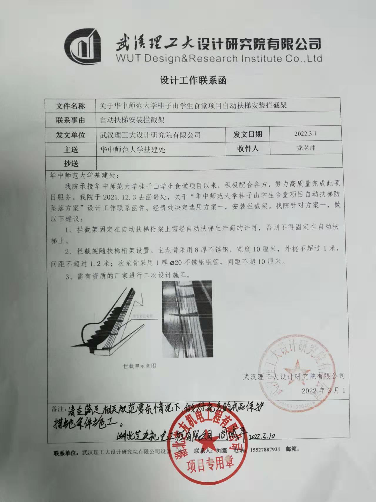 华中师范大学桂子山校区学生食堂自动扶梯安装拦截架(地下室~三楼,共计3个安全防护面,安全防护形式以设计院提供参考方案考虑,见附件要求:1.需有资质的厂家进行二次设计施工。2.拦截架随扶梯桁架设置。主龙骨采用 8 厚不锈钢, 宽度10厘米,外挑不超过 1 米,间距不超过1.2米;次龙骨采用1厚ø20 不锈钢钢管,间距不超 10 厘米),工程质量要求达到合格标准,以及学校主管部门的要求。